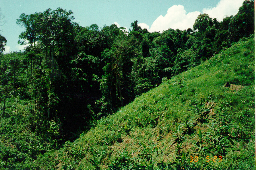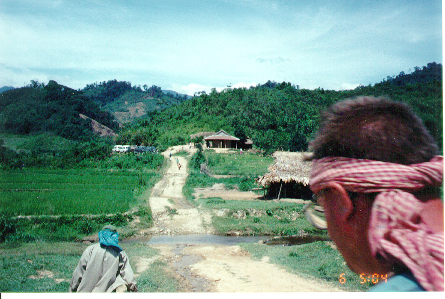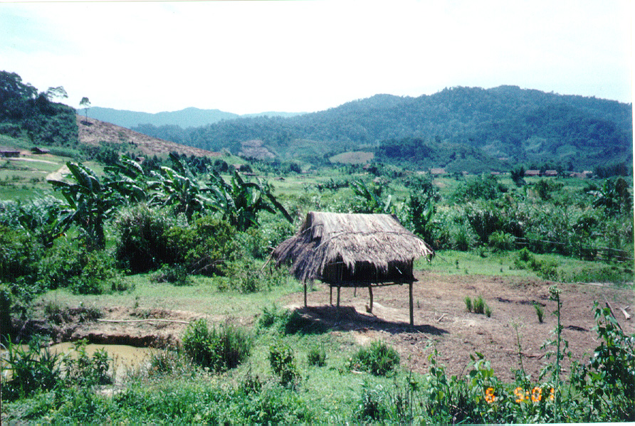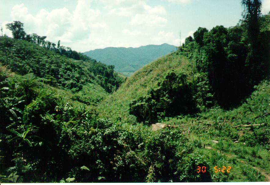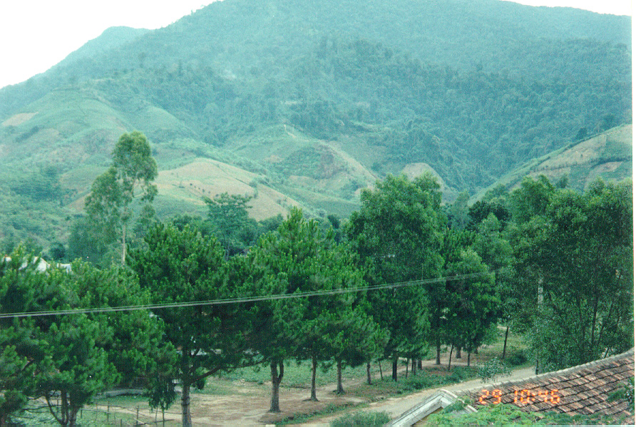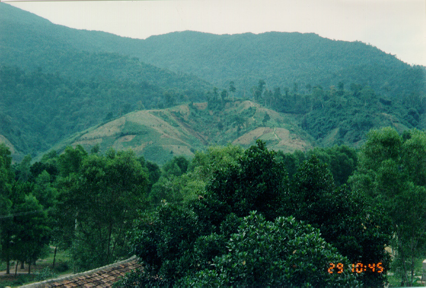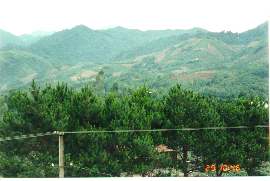 WE STARTED OFF IN A LOUI,  A SMALL TOWN IN THE A SHAU.   STANDING FROM THE SO-CALLED HOTEL, I TOOK A FEW PICTURES OF THE MOUNTAINS.   YOU CAN SEE A GOOD EXAMPLE OF THE SLASH AND BURN FARMING  THEY DO ON THE MOUNTAIN SIDES.