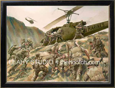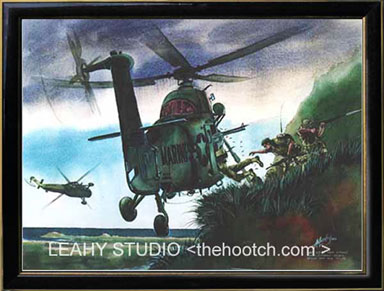 Red Lion UH-34s of HMM-363 pull a Marine Recon Team out of a hot landing point along a ridge in Elephant Valley, I Corps, RVN on November 11, 1967.  Edition of 950 prints, with 50 artist's proofs.
