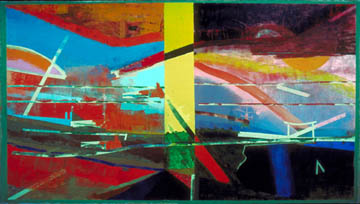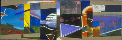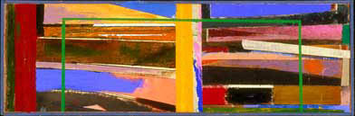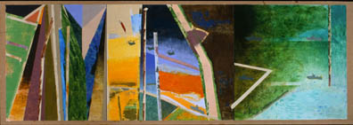 "This painting (Wall 167), so far, is presented tacked to the wall, rather than framed on a stretcher. It is Triptych-like: land/jungle, air/combat assault, sea/riverine."
