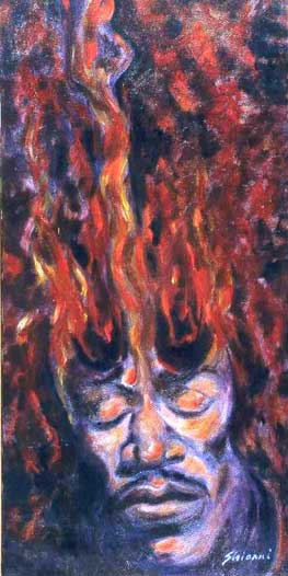 "I have a very special place in my heart for Jimi Hendrix. He is art. His music and message will grow as time passes. In this painting, his image is within the body of his Stratocaster. The guitar is engulfed in flames."