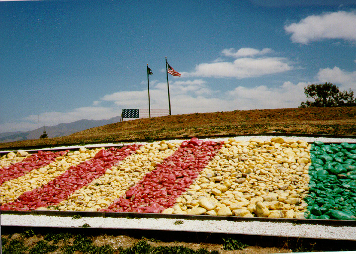A picture showing the "cemetary" with the crosses and the U.S. and POW flags the flags are somewhat tattered and need to be replaced