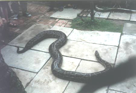 Just after the meal was served, four locals carried in a python weighing a couple hundred pounds and measuring 10 or more in length. They had the courtesy to drop it on the floor in the center of the cafe (as opposed to dropping it on anybody's table), and it proceeded to make its way around the premises.