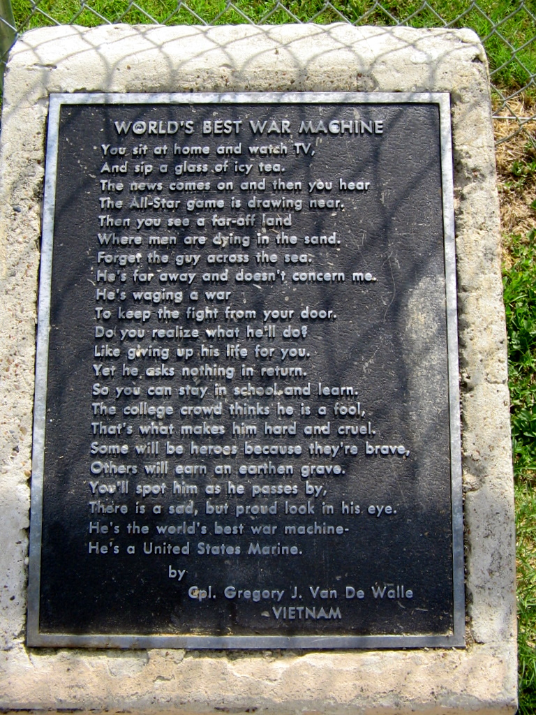 You are at peace with family, friends, buddiesfrom the war, and I know that you are still watching over those of us thatyou left behind. I salute you with a final "SEMPER FI".