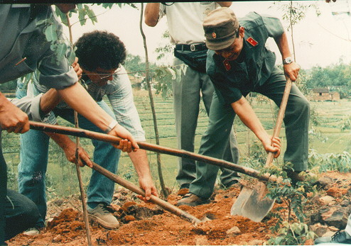 American Veteran, Mike Boehm, and Vietnamese veteran, Nguyen Nhu Nga, break ground together for the tree planting at the Peace Park in Ha Bac Province, Vietnam, May 11, 1995.